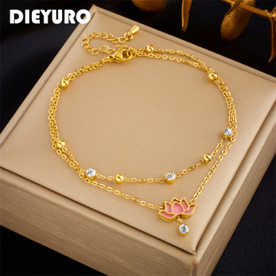 DIEYURO 316L الفولاذ المقاوم للصدأ الوردي لوتس زهرة الخلخال للنساء فتاة الاتجاه الجديد متعدد الطبقات سلاسل غير يتلاشى مجوهرات هدية حفلة